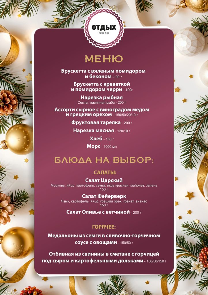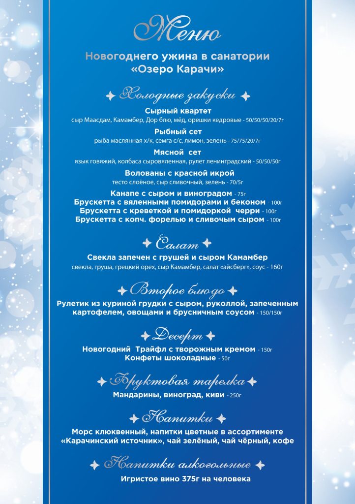 • 3-разовое питание — диетическое, разнообразное, с праздничным новогодним меню